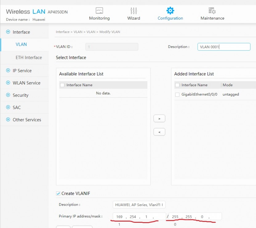 6. В VLAN1 поменяем IP и маску (можно не менять, по Dhcp получит сам)